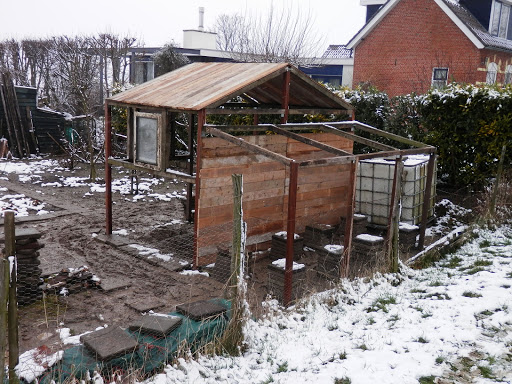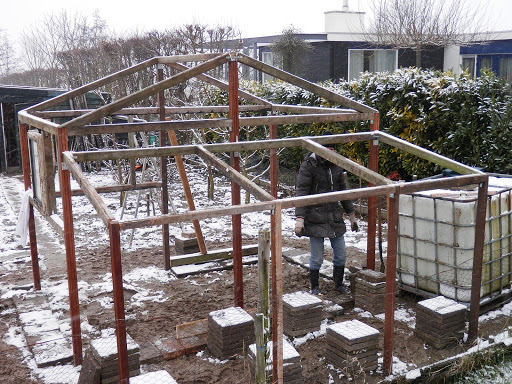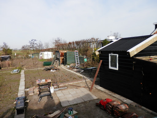 Veel materiaal hebben we van de oude tuin meegenomen, alles wordt hergebruikt. Een deel is gekregen van medetuiniers of voor weinig geld overgenomen of op de sloop gehaald. Het enige wat we nieuw hebben aangeschaft is het dak. Gewoon van bitumen maar voorlopig is dit afdoende.