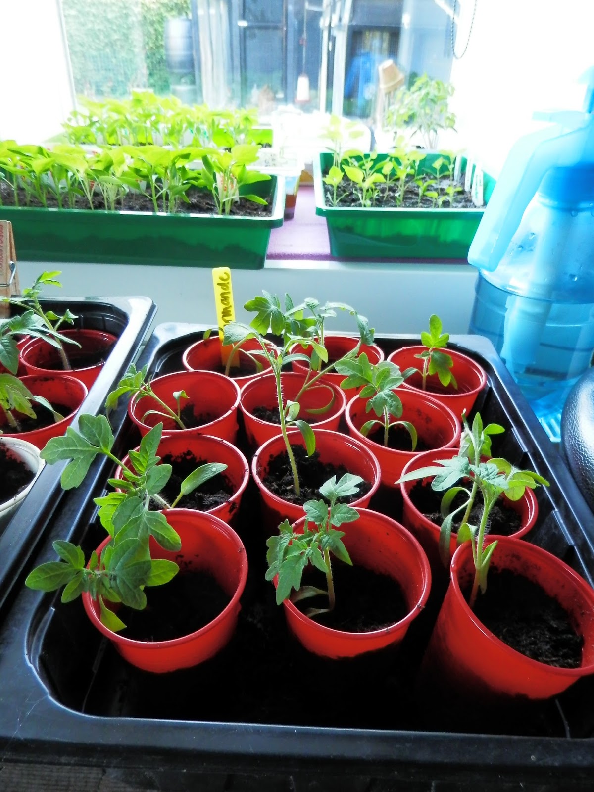 Vandaag was het tijd om de tomaten te verspenen. Verpotten dus. Ze groeiden het bakje uit en hebben al flinke wortels. Voorzichtig los gemaakt met de achterkant van een lepel en met een beetje potgrond in een plastic beker overgeplant. Gelijk water erbij en afwachten. Een plastic beker is natuurlijk niet zo duurzaam en groen, maar aangezien ik te weinig potjes heb moet het maar. Ze gaan wel jaren mee. Ik heb het ook eens met wc rollen geprobeerd maar deze beschimmelden steeds, dus daarom toch maar met plastic bekers.