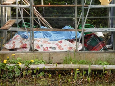 De slaplantjes die al in de volle grond staan heb ik maar toegedekt met een fleecedekentje. Hopelijk redden ze het. Voor één plantje was het doek te klein, dat is een goede test om het verschil te kunnen zien, met of zonder fleece.