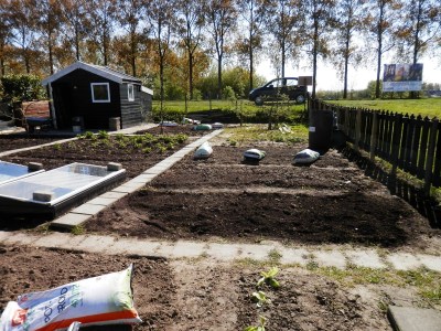 Verder nog compost gehaald en weer een paar bedden bewerkt, wortels gezaaid en plantuitjes gepoot. Ik heb verschillende wortelsoorten gezaaid> Parijse markt (Parijse worteltjes, dus sneller oogstbaar), Amsterdam (zomerwortel) en Flakkee en Berlikum (beiden winterwortels). Het kippengaas is ter bescherming tegen vogels want die houden erg van zaadjes.