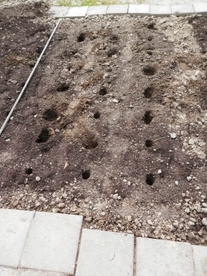 Vandaag zijn de aardappelen de grond in gegaan. De bintjes stonden sinds eind februari in de strijkkamer voor te kiemen en als je goed kijkt op de foto zie je dat dit niet helemaal goed is gegaan. Het voorkiemen heeft te lang geduurd. In het begin waren het goede dikke kiemen maar later zijn ze lang en dun geworden. Ze hebben ook een paar keer per ongeluk in de zon gestaan, dat kan ook de oorzaak zijn. Daarom gaan ze nu de grond in. Een paar dagen geleden heb ik de grond voorbereid met compost en koemestkorrels. Binnenkort nog een beetje houtas, voor verbetering van de knolvorming en bewaarbaarheid van de knollen.