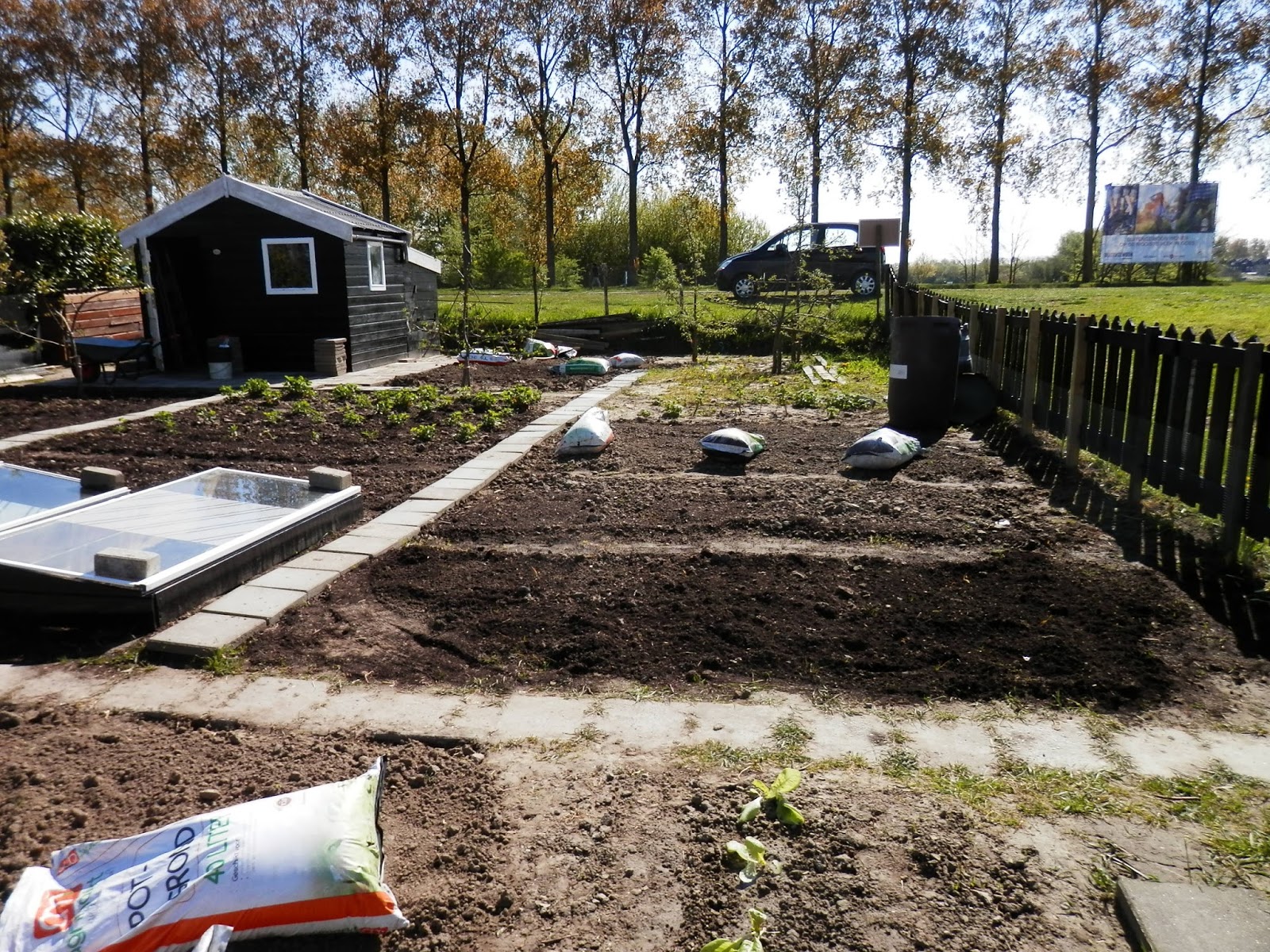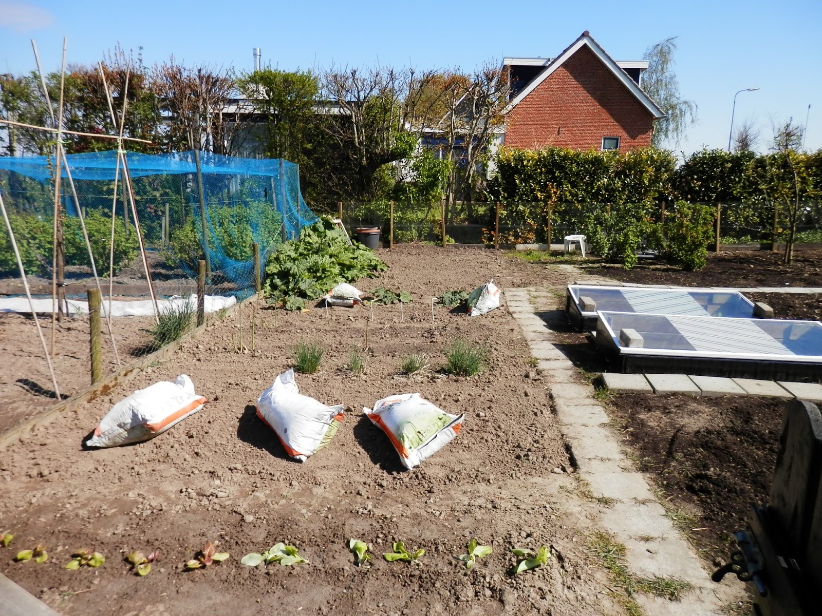 Vandaag zijn de aardappelen de grond in gegaan. De bintjes stonden sinds eind februari in de strijkkamer voor te kiemen en als je goed kijkt op de foto zie je dat dit niet helemaal goed is gegaan. Het voorkiemen heeft te lang geduurd. In het begin waren het goede dikke kiemen maar later zijn ze lang en dun geworden. Ze hebben ook een paar keer per ongeluk in de zon gestaan, dat kan ook de oorzaak zijn. Daarom gaan ze nu de grond in. Een paar dagen geleden heb ik de grond voorbereid met compost en koemestkorrels. Binnenkort nog een beetje houtas, voor verbetering van de knolvorming en bewaarbaarheid van de knollen.