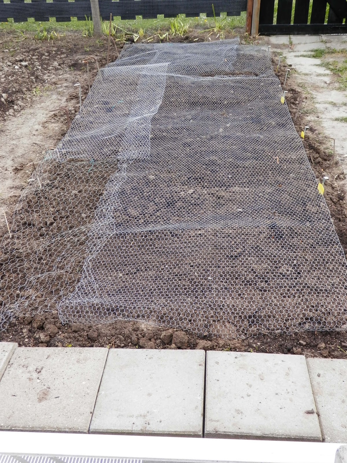 Verder nog compost gehaald en weer een paar bedden bewerkt, wortels gezaaid en plantuitjes gepoot. Ik heb verschillende wortelsoorten gezaaid> Parijse markt (Parijse worteltjes, dus sneller oogstbaar), Amsterdam (zomerwortel) en Flakkee en Berlikum (beiden winterwortels). Het kippengaas is ter bescherming tegen vogels want die houden erg van zaadjes.