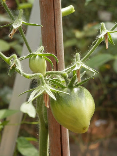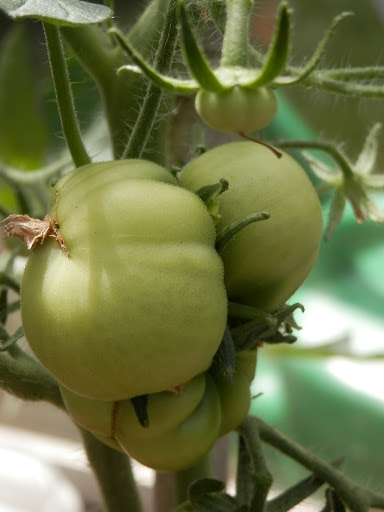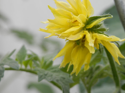 Bovenstaande foto is nu typisch een bloem van een gedrochtje. Sorry voor de naam maar ik kan het niet anders formuleren. Onderstaande vleestomaat is daar een voorbeeld van. Bij de bevruchting gaat er iets mis waardoor er een dubbele bloem ontstaat. De tomaat die daar uit groeit is helemaal in elkaar gefrommeld. Je ziet het meestal bij vleestomaten en vaak bij het eerste bloemetje.