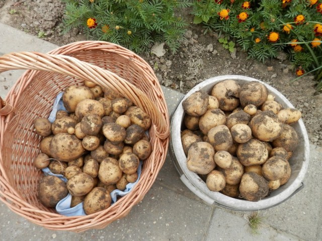 Ja ja ik kon natuurlijk niet langer wachten…. dus voorzichtig met 1 plant begonnen, en dat viel niet tegen ( nou ja een beetje dan) dus daarna volgden er al snel meer, en voordat ik het wist was het hele vak leeg 😉 Ik ben een beetje een schijtert als het gaat om aardappelteelt. Ieder jaar neem ik me voor om ze langer in de grond te laten zitten zodat de aardappels beter te bewaren zijn, maar als ik dan zie dat medetuiniers alles uit de grond gaan halen wordt ik onrustig. Want, stel dat de phytopthora ( schimmelziekte voor de leken onder ons) toeslaat, dan heb je ineens niets meer als je er niet op tijd bij bent. Maar medetuiniers hadden hun aardappels eerder geplant, want.. wij moesten immers eerst een schuur bouwen en waren daardoor heel laat… maar ja…. Wat doe je dan, advies inwinnen?