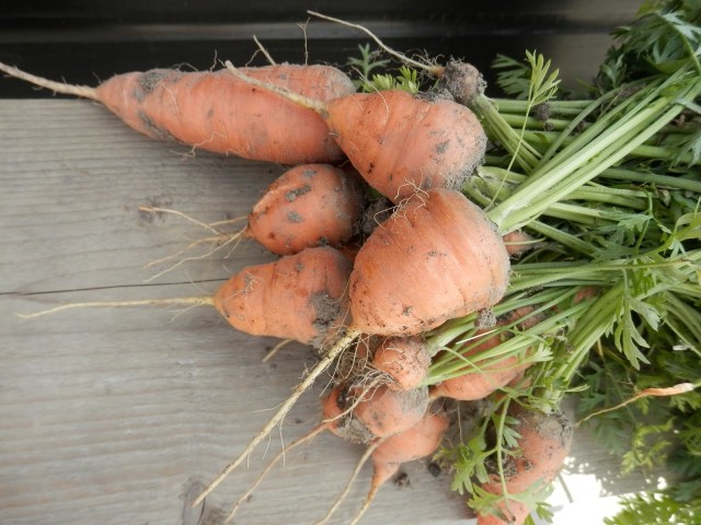 De eerste Parijse worteltjes! Een enkeling had al eerder geoogst moeten worden, het is al een lange wortel ipv een ronde.