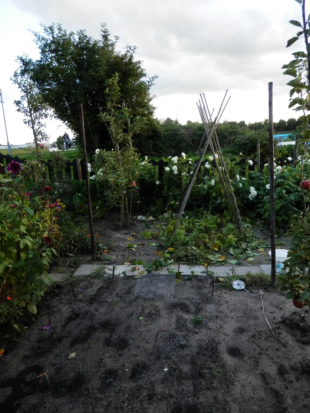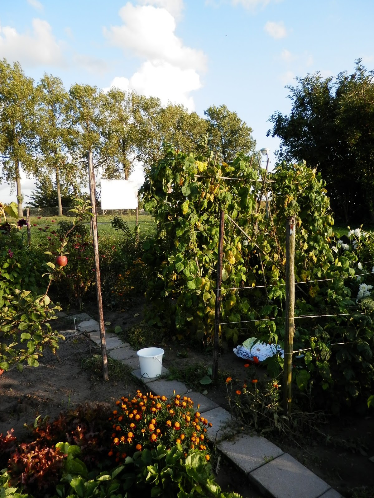 Gisteren heb ik de bonen opgeruimd. Het was niks meer, en het wordt ook niks meer nu het steeds regent en er ook geen zicht meer is op warmer weer. Er vormen zich geen bonen meer en de planten worden langzaam ziek.