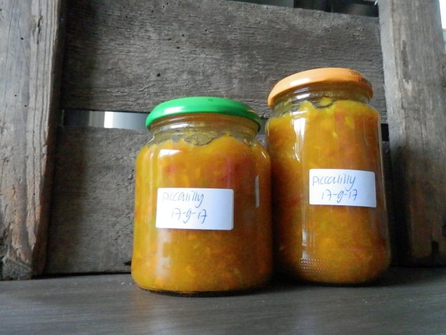 - Voeg wat water of azijn toe aan de maizena en meng het tot een samenhangend geheel. Giet dit bij de groente en laat het 3 minuten doorkoken. Als het te dun is kan je nog een beetje maizena toevoegen tot de gewenste dikte. Giet de piccalilly in gesteriliseerde potten( zie hier de werkwijze) en zet ze 5 minuten op zijn kop. Daarna draai je ze terug. Na verloop van tijd hoor je het deksel intrekken. Controleer alle deksels voordat je ze opruimt. Als je het deksel nog kan indrukken is het niet vacuüm getrokken en kan je het beter in de koelkast bewaren.