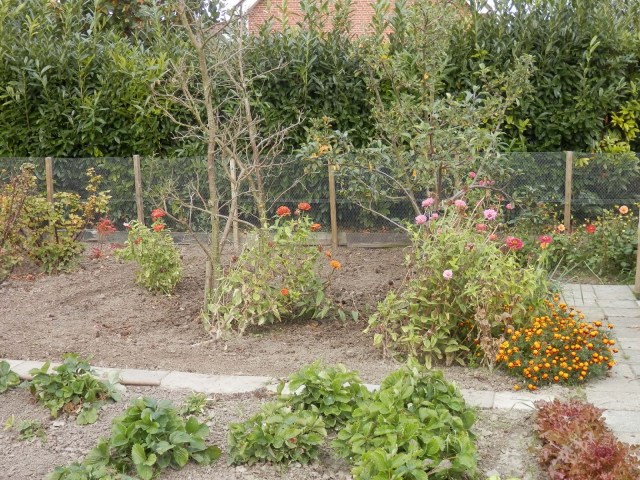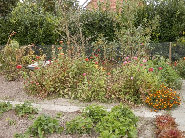 De eenjarige zinnia’s gaan dood. Ze hebben me vanaf juni wekelijks verse bloemen op tafel gegeven, wat een rijkdom. Het grootste gedeelte is nu verwijderd, de zaden zijn eruit geknipt en de planten zijn daarna op de composthoop beland. Een paar planten mogen nog blijven tot de eerste nachtvorst, zodat ik nog iets langer van de bloemen kan genieten.