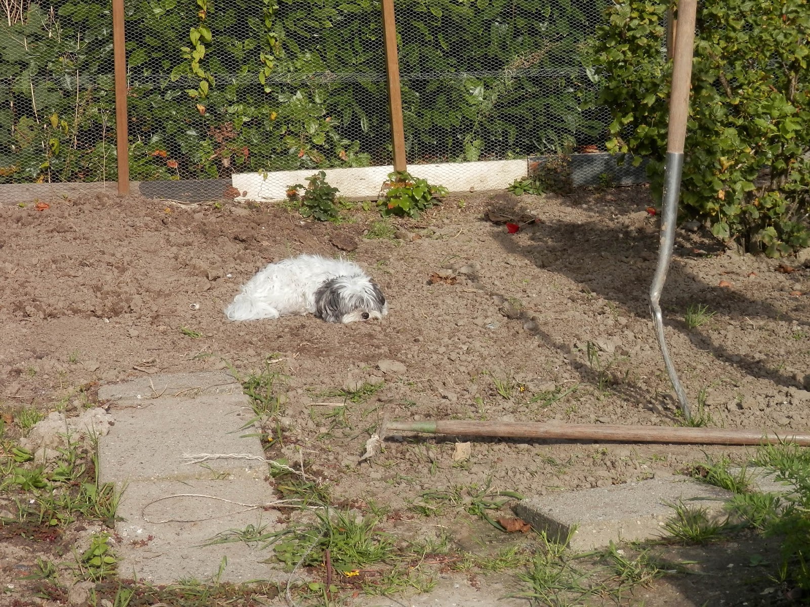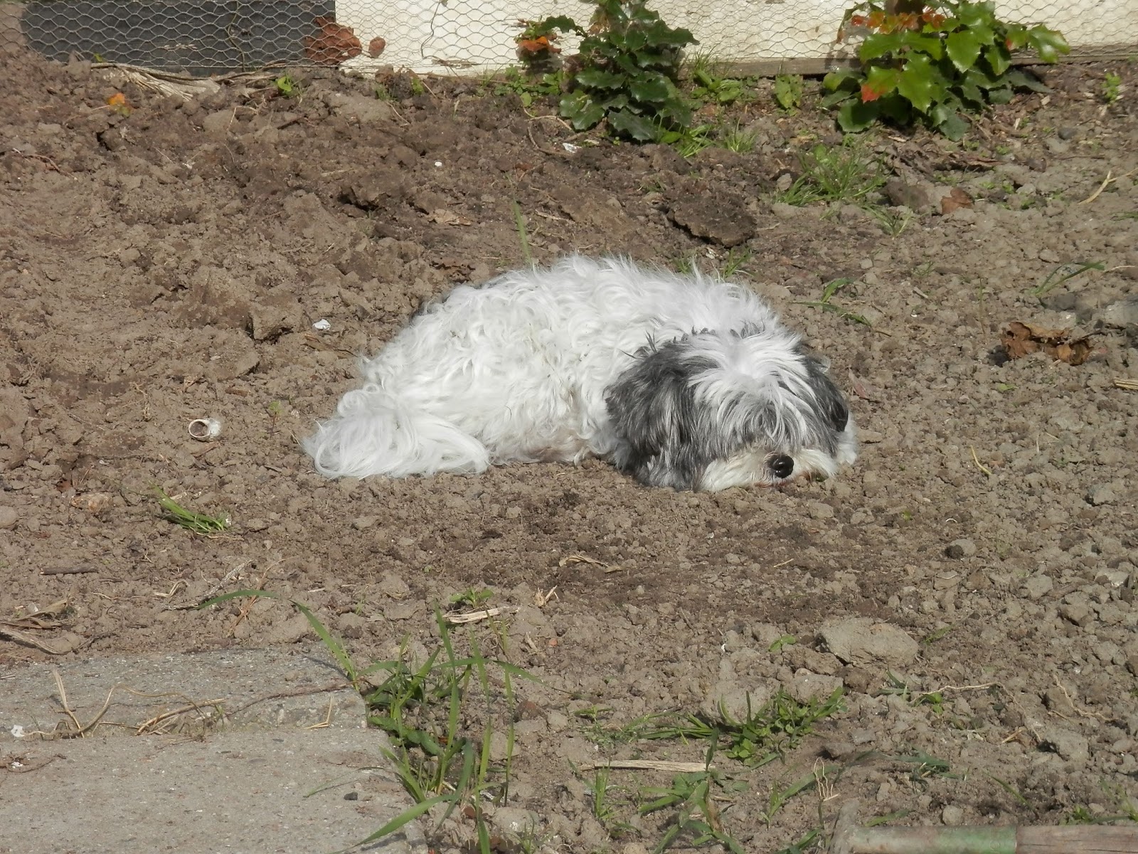 Luna voelt zicht steeds beter op haar gemak in de nieuwe tuin. In het begin blafte ze op iedere passant op de dijk maar dat is nu gelukkig over. Ze ligt graag in het zonnetje te genieten maar blijft waakzaam. Het blijft tenslotte haar terrein.