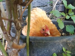 Happy legt haar eieren in een emmer