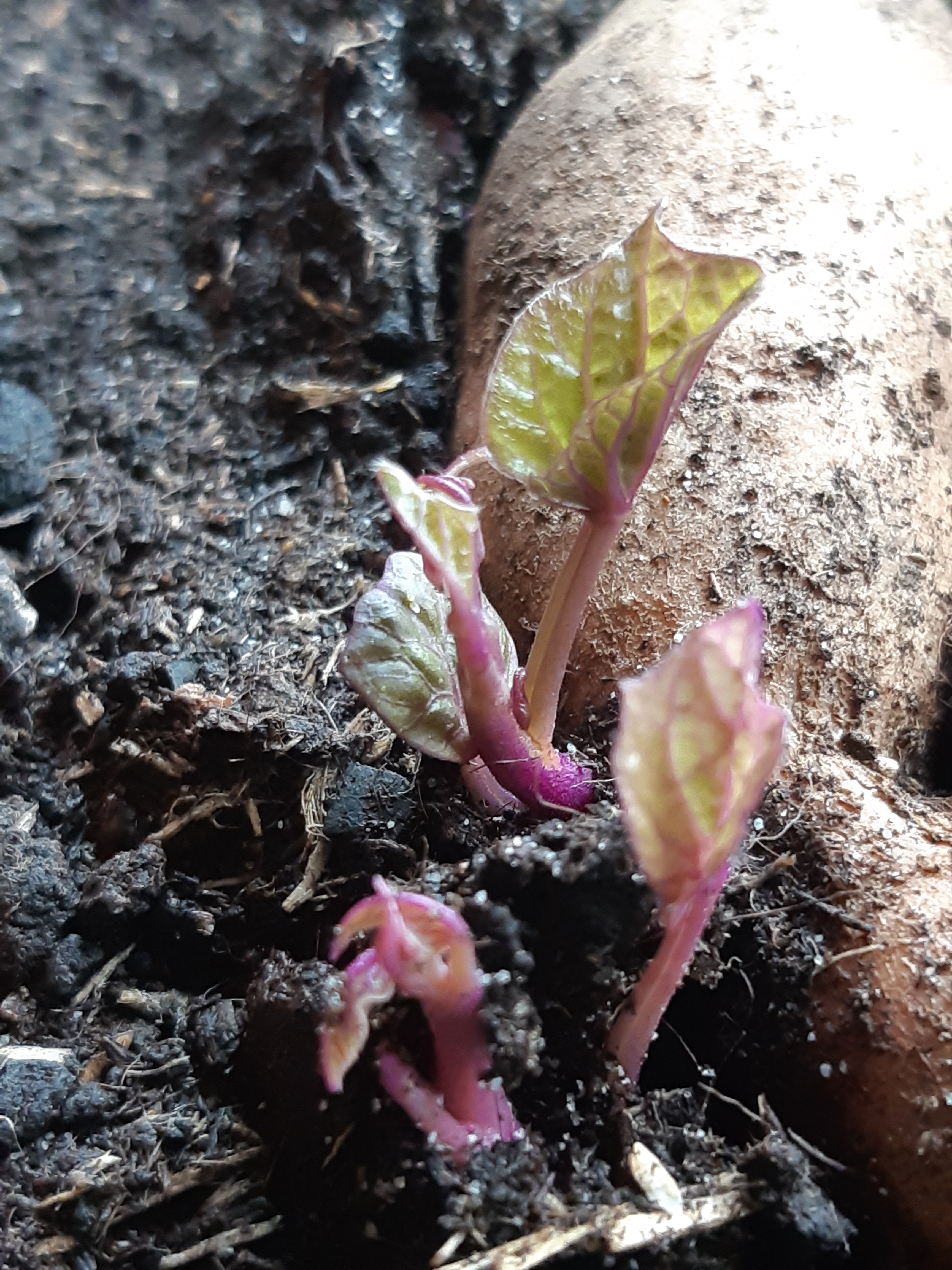 Ik kocht ook nog een zoete aardappel in de supermarkt. Deze komt oorspronkelijk uit Portugal, een land met natuurlijk een warmere temperatuur dan bij ons maar geen tropisch klimaat dus het proberen waard. Deze bataat kwam naast mijn eigen pootgoed te liggen en ontkiemde zeer snel, binnen zes dagen stonden er puntjes op de knollen. Nu afwachten of ze groter groeien.