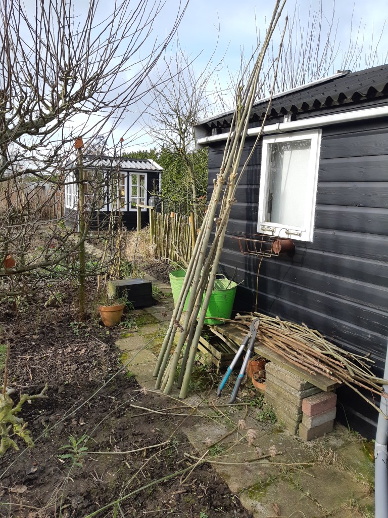 In februari snoeien we altijd de fruitbomen en fruitstruiken en dan hebben we een berg takken als restmateriaal. Ook snoeiden we de wilde bomen die achter mijn moestuin staan. Deze bomen zijn “aan komen waaien” (ik weet ook niet welk ras het is) en groeien enorm snel, ik snoei ze om de twee jaar om het hout te gebruiken als productiehout. Hiervan maak ik tipi’s en boogjes in de moestuin. Op Pinterest maar ook op andere Social media zijn veel leuke ideetjes te vinden hiervoor.