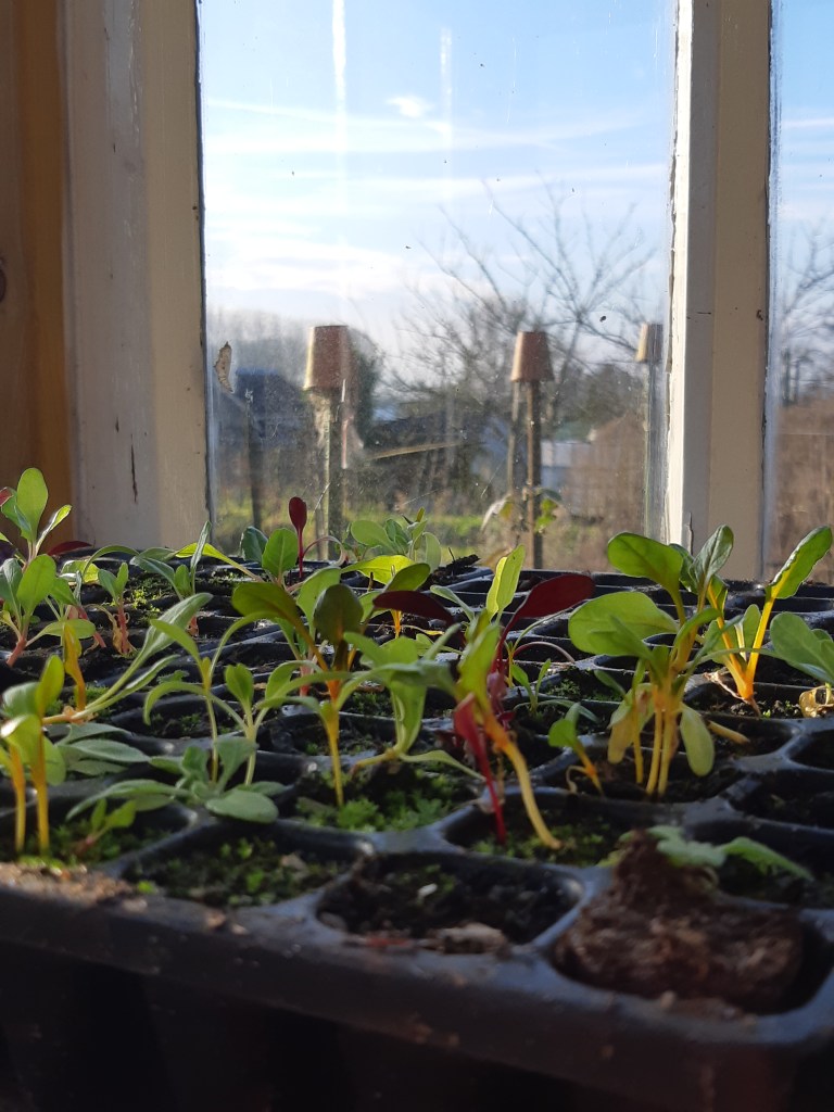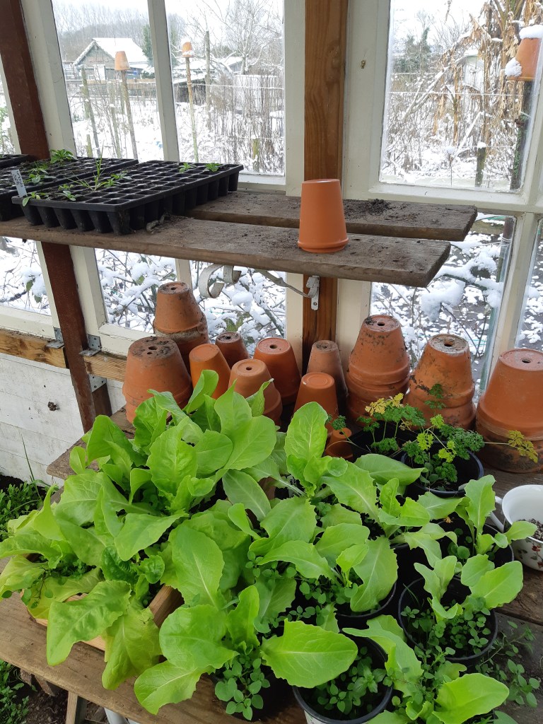 Tot slot een foto uit de kas, waar de kropsla hard groeit. Ik ben nog bezig met het vervangen van de platte bak, dus ik hoop dat de plantjes het nog even volhouden. O ja, en ik heb gezaaid in zelfgemaakte compost, bij wijze van experiment. De kropjes groeien goed, maar het onkruid in de potjes ook 🙂