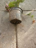 Aardbeienstekken planten. De wortels komen hier al onder de pot uit. Tijd om te planten.