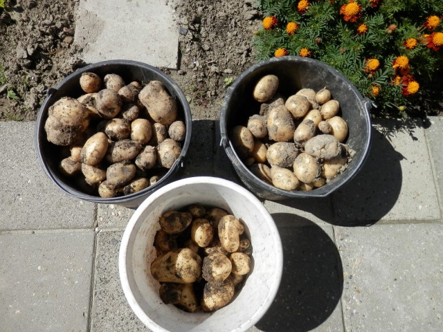Gistermiddag weer een deel van de moestuinoogst binnengehaald. Ik kon mijn geduld niet langer bedwingen. Afgelopen week voorzichtig 2 aardappelplanten gerooid van het ras Bintje. En ze hadden een redelijk formaat, dus…. alles eruit gehaald.  Opnieuw 2 1/2 emmer aardappelen, ik schat dit keer zo’n 15 kg dus ik ben best tevreden. We eten altijd tot rond de jaarwisseling eigen aardappelen, dat zal dit jaar ook wel lukken. Samen met de Lekkerlanders hebben we zo’n 26  kg schat ik.