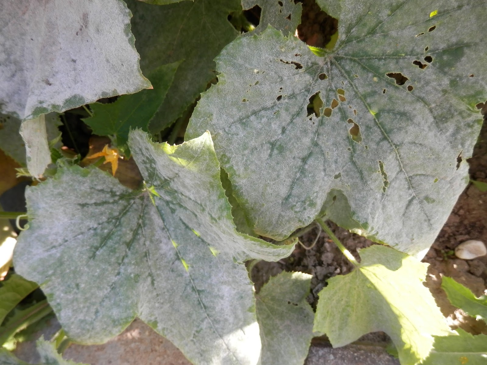 Dit is het blad van de augurk, maar ook de courgette’s en de pompoenen hebben er last van.
