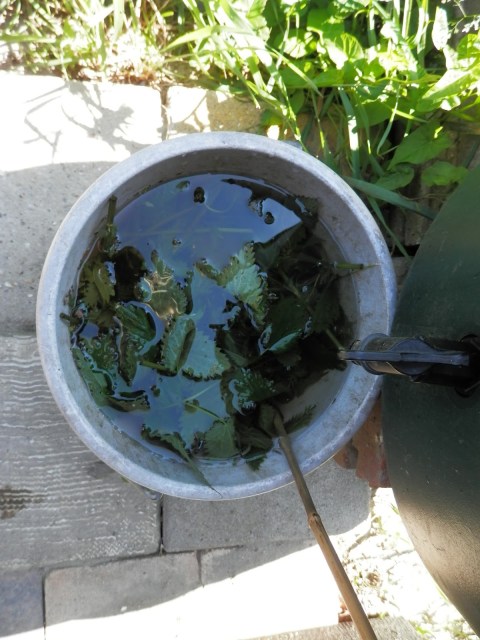 Ik heb ook nog nieuwe brandnetels gevonden. Met de brandnetels maak ik brandnetelgier. Het is een vreemde hobby hoor, tuinieren.