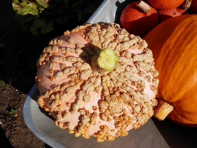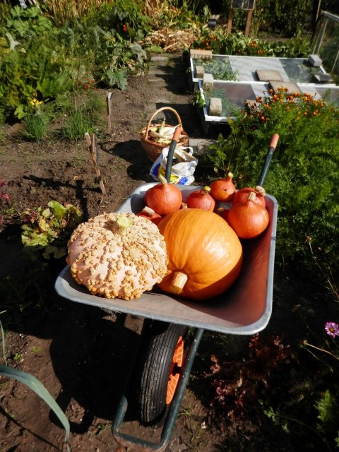 De pompoenen hebben nog een middagje gedroogd in de zon, en de kleine pompoenen zijn daarna opgeslagen in de schuur. De grote liggen buiten voor de sier. Voorlopig…