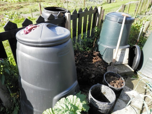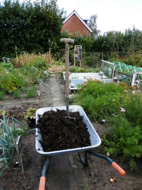In een jaar tijd is de compost voldoende gerijpt. En de resten van de maisplanten moeten opgeruimd worden, dus hoog tijd om een bak leeg te maken. Er zitten nog wel wat takken in die niet goed verteerd zijn.  Andere jaren zeefde ik de grond, en gooide dan het niet verteerde materiaal terug in de bak  maar daar had ik nu geen tijd voor. Dus alles in de kruiwagen gegooid en zo bij de fruitbomen gekieperd.