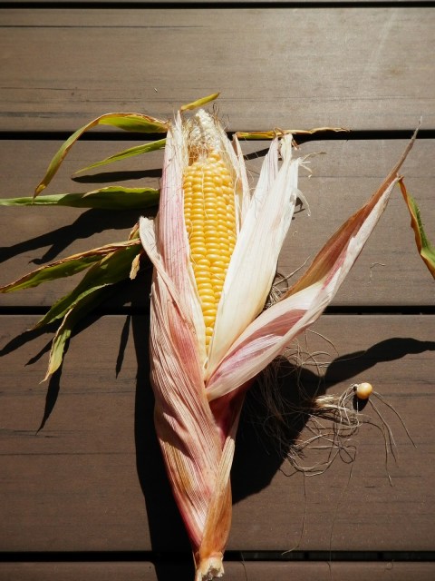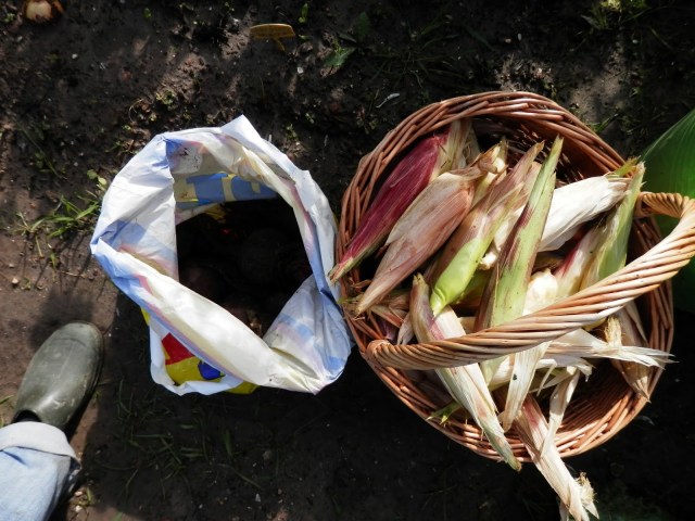 De oogst blijft maar komen. Opnieuw zo’n 40 maiskolven geoogst, rucola, frambozen, pompoenen, bieten, bloemen, zaden… en een meloen!!
