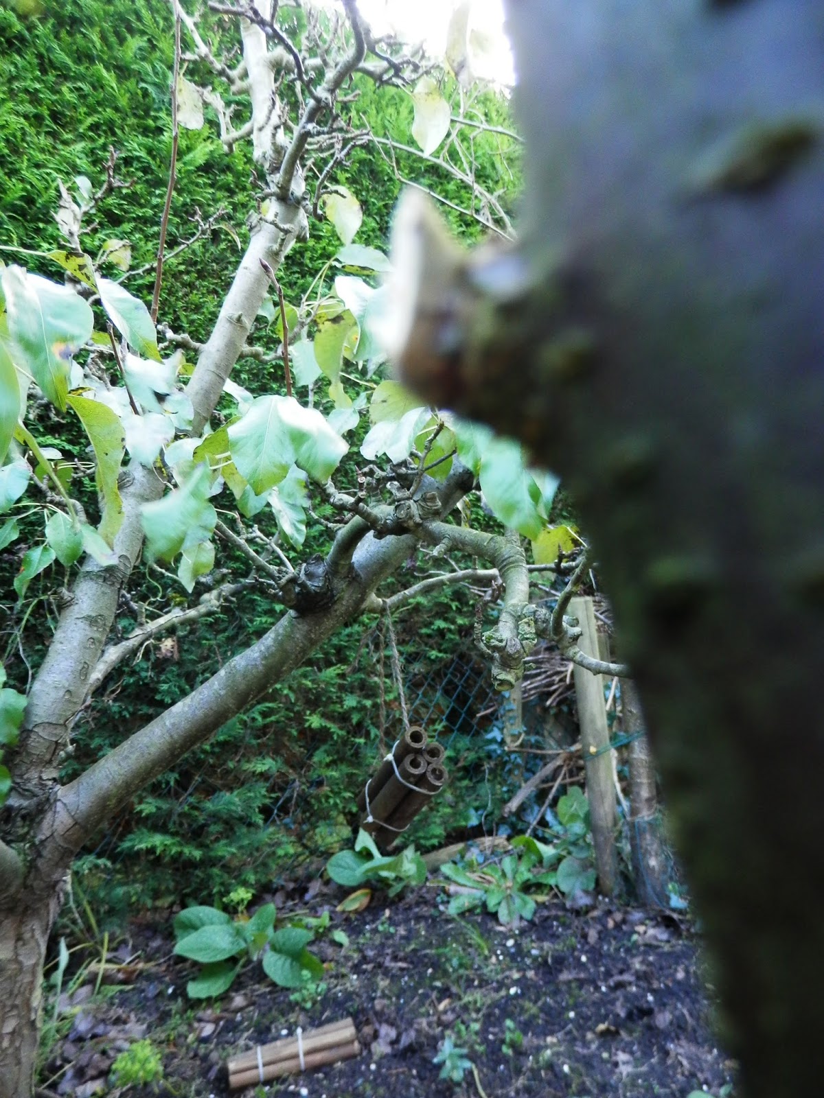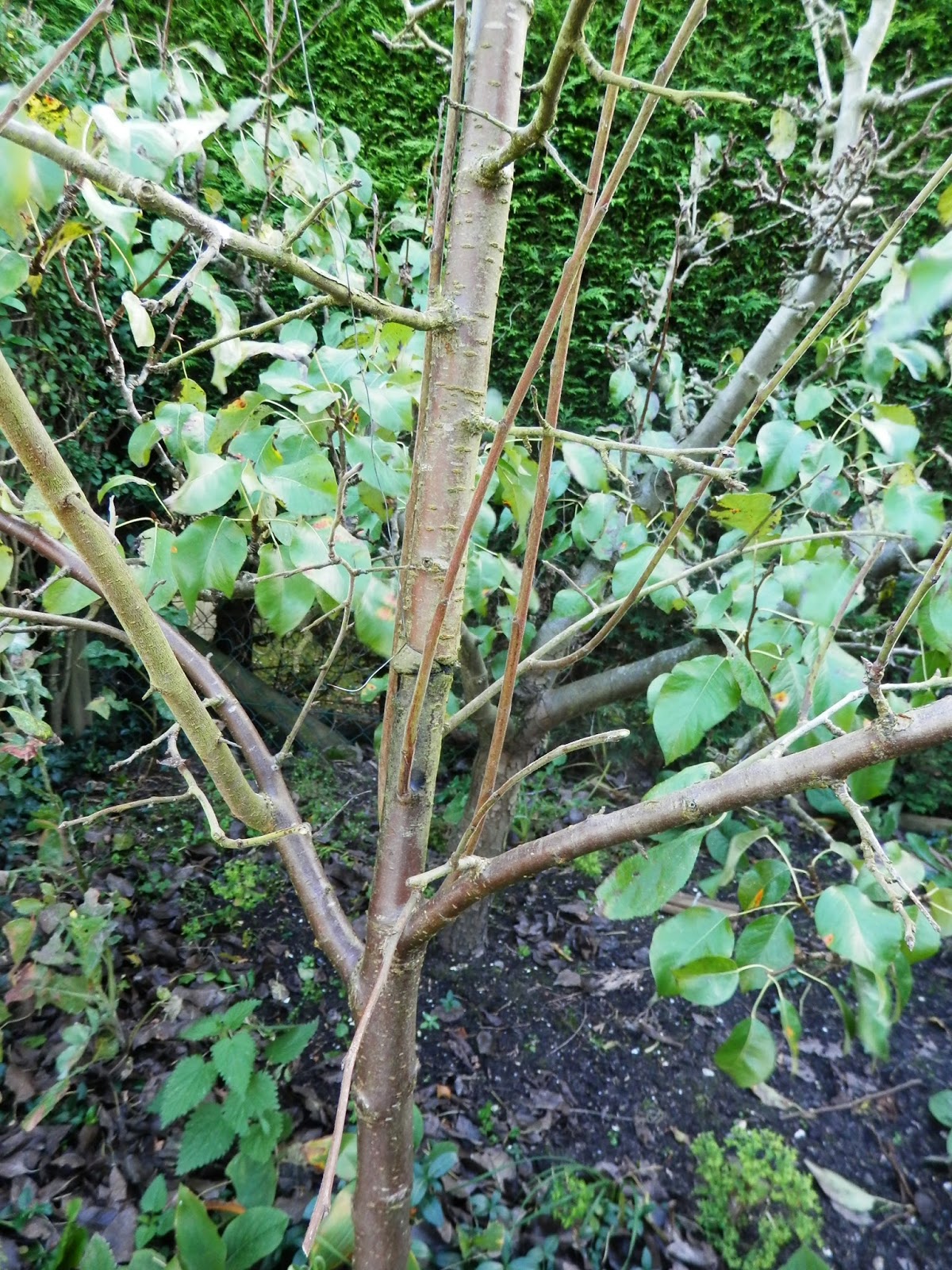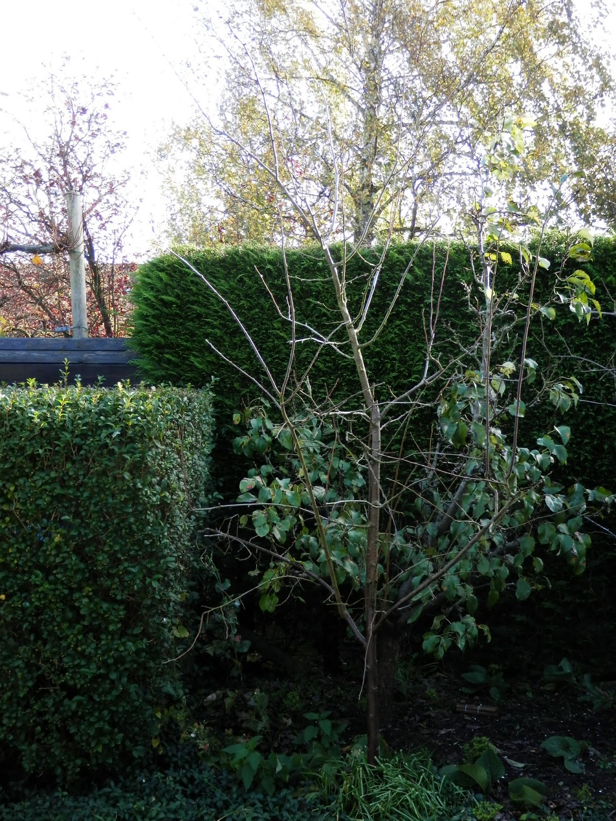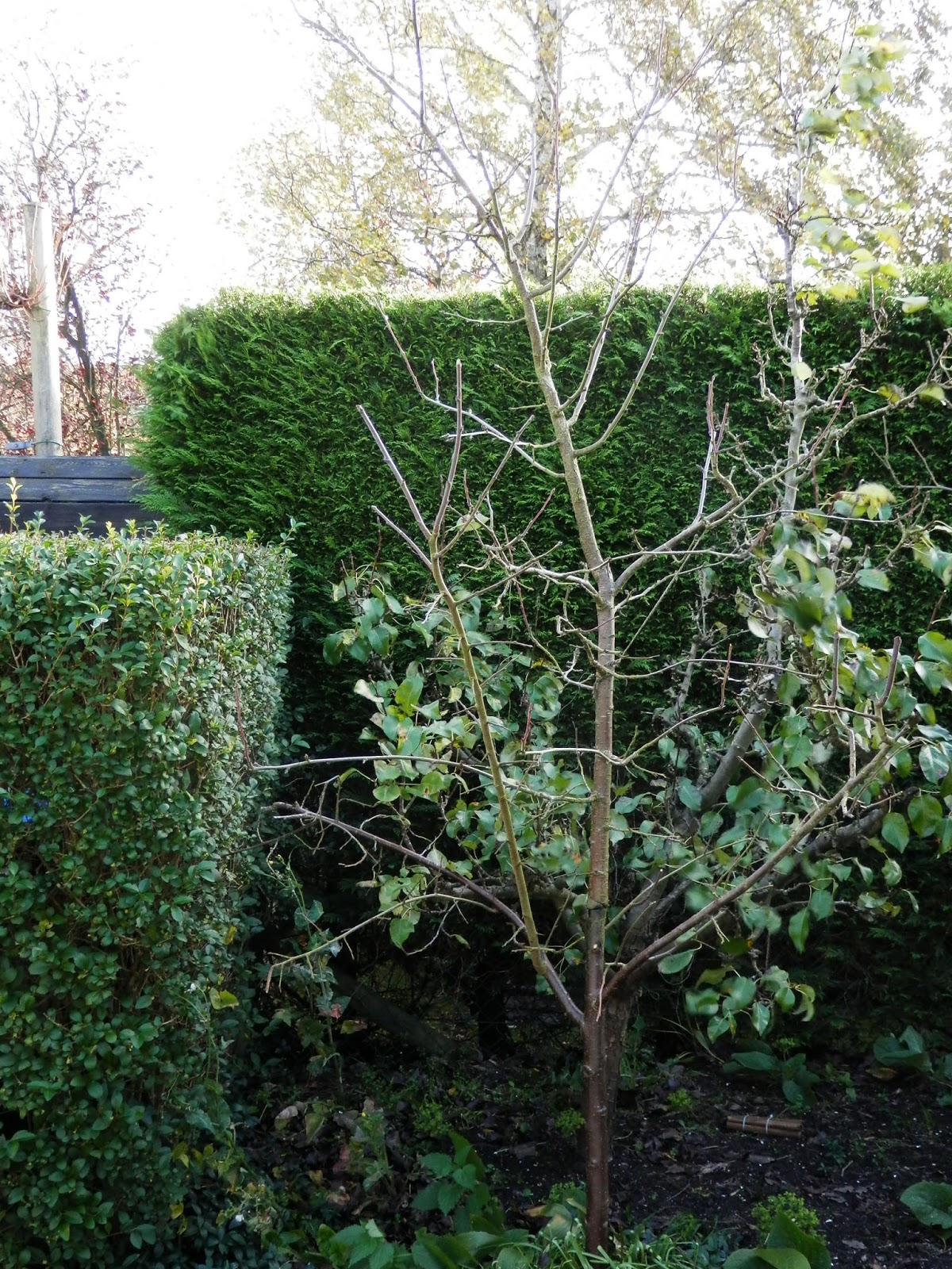 De fruitbomen in de achtertuin zijn gesnoeid. We hebben daar een perenboom ( Conferance handpeer) en 2 pruimenbomen ( ReineVictoria) . De perenboom ( de achterste boom op de foto) heeft een verhaal. We hebben hem gered van de dood. Het is niet zo dramatisch als het klinkt hoor. Hij stond bij een fruitteler die de grond van zijn boomgaarden had verkocht aan een projectontwikkelaar. De boom is dus goed onderhouden, en dit heb ik de afgelopen jaren netjes bijgehouden. Hij geeft ieder jaar oogst, maar met kleine peertjes. Waarschijnlijk omdat wij hem niet zo goed bemesten als zou moeten. Mogelijk zijn de coniferen die op een meter afstand staat mede oorzaak, ze nemen veel voeding weg en veroorzaken perenvuur op het blad. Mogelijk is de boom daardoor verzwakt. Helaas is hier niets aan te doen, de bacterie die perenvuur veroorzaakt trekt zich in de winter terug in de coniferen, om in het voorjaar de boom weer aan te tasten. De bekende visieuze cirkel.