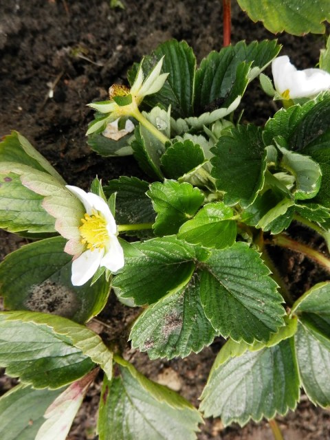 De pasgeplante aardbeien persen er nog een bloemetje uit, in de hoop nog te zorgen voor nageslacht. Tuinieren is soms hard zijn, want na de foto heb ik de bloemetjes om zeep geholpen😀