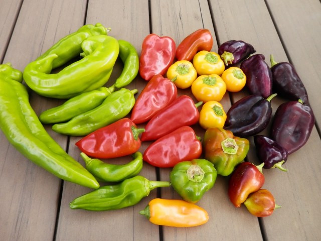 Nog een vrolijk plaatje tot slot… de eerste grote paprika oogst! De groene puntpaprika’s zijn natuurlijk niet rijp en minder lekker, maar die gebruik ik altijd in een stoofpotje. De paarse ( ras Macho) zijn overigens ook onrijp, ze zouden moeten kleuren naar diep rood. Vooral de gele ( ras Doe Hill) zijn superlekker.
