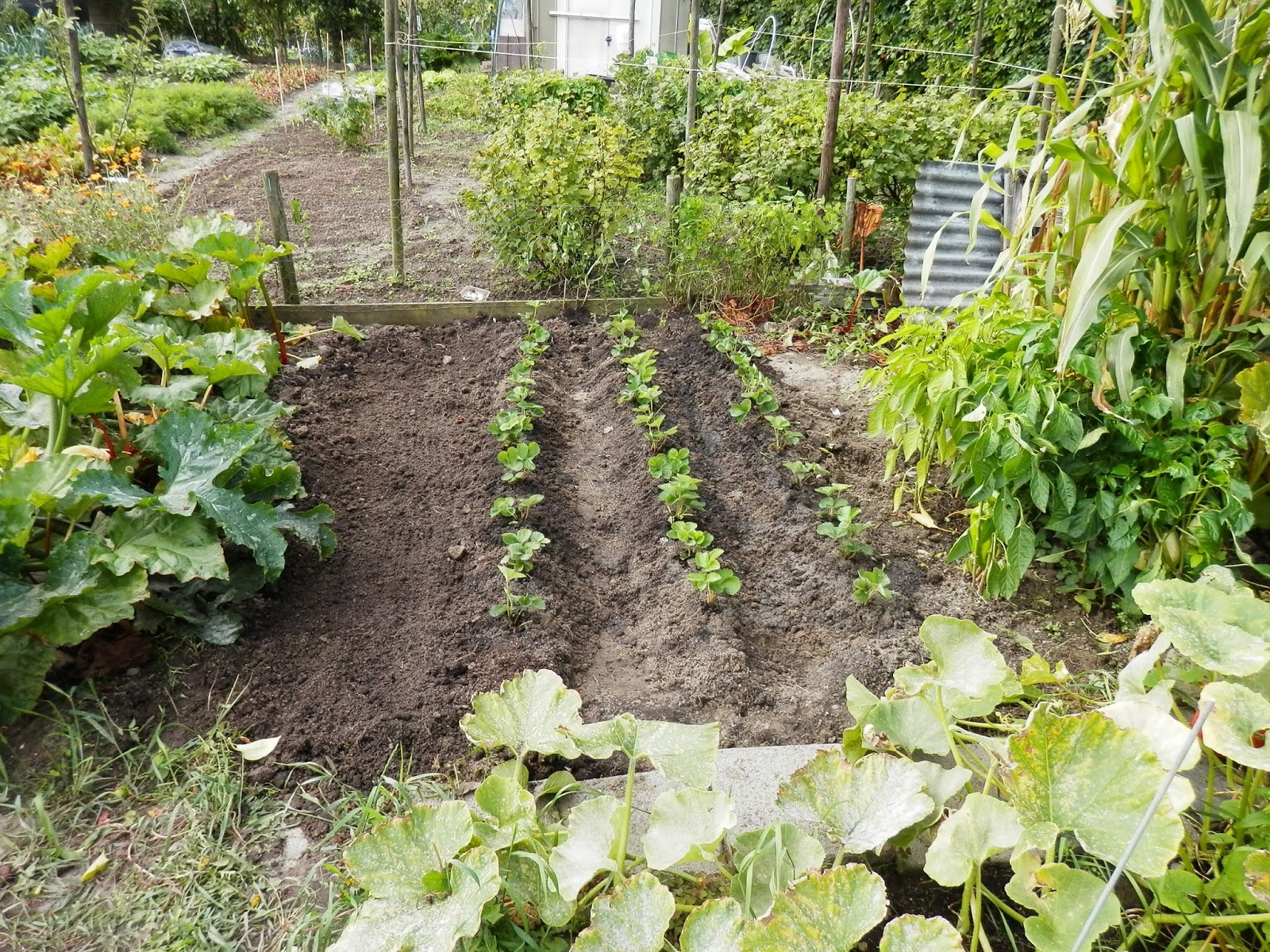 Ik heb de aardbeien op lage ruggen gezet, om te voorkomen dat ze met hun voeten in het water komen te staan als er veel regen valt. Plantafstand 25 cm tussen de plantjes in de rij, 70 cm tussen de rijen. ( Onder de plant doe ik altijd een beetje koemestkorrels, en daarna een beetje houtas in het gietwater.) Dat laatste is goed voor de vruchtzetting.