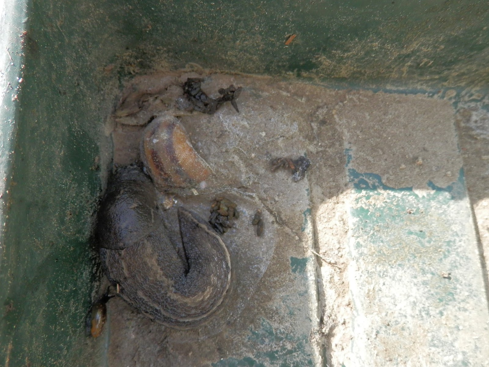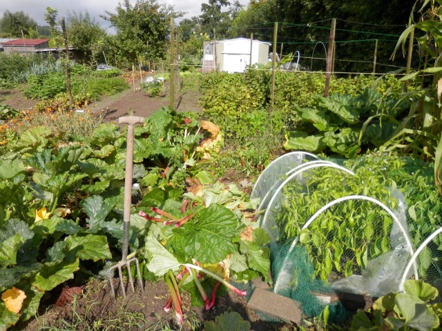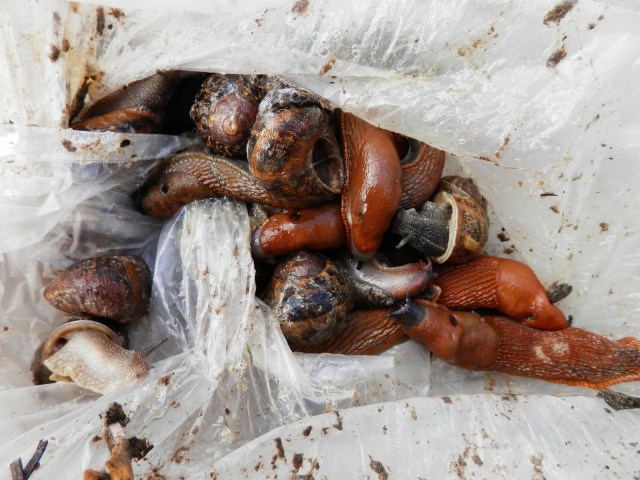 Onder de rabarber was het een waren slakkeninvasie. Ik heb ze allemaal verzameld en buiten het dorp weer losgelaten. Ze waren zelfs te dik voor onze kippen. Regeren is vooruitzien. Door de slakken weg te vangen kunnen deze in ieder geval geen nieuwe eitjes leggen in mijn moestuin.