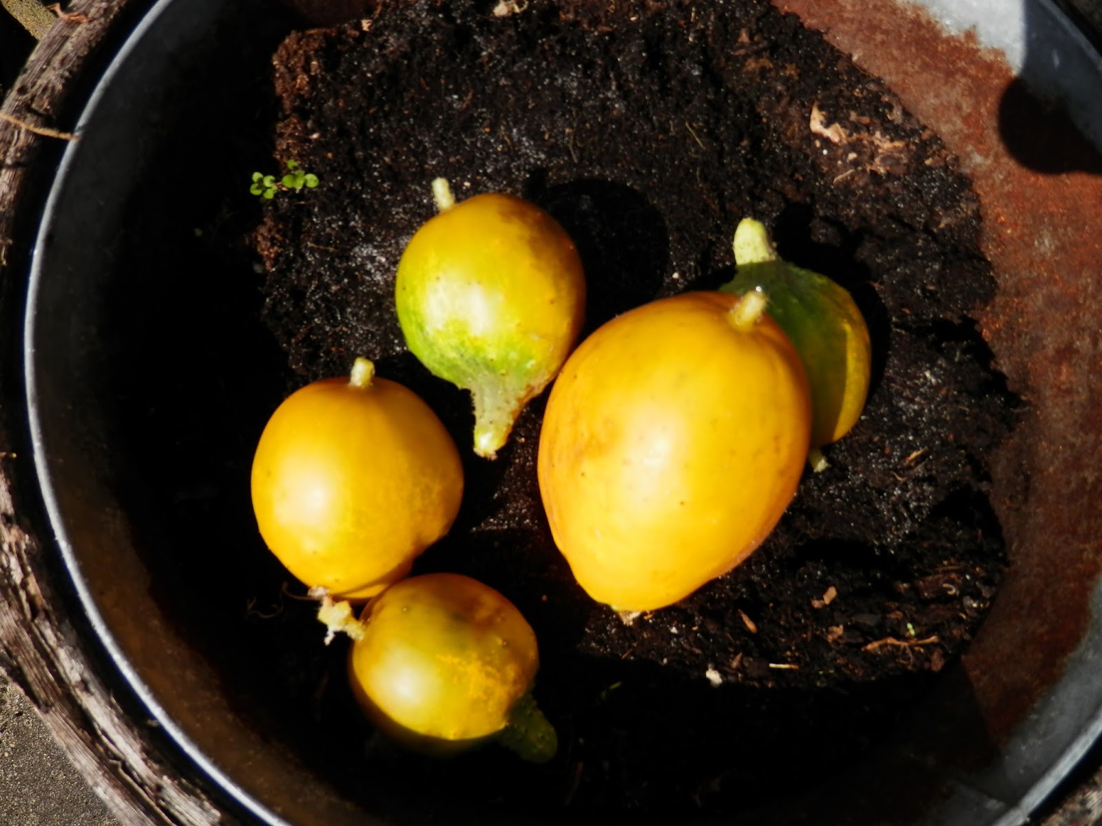 De komkommers zijn dit jaar niet gelukt. Dat is voor het eerst, want ik kweek ieder jaar komkommers in een pot. Het zijn soort gele ballen geworden. Ze waren natuurlijk eerst groen maar ze hangen er al een tijdje😊