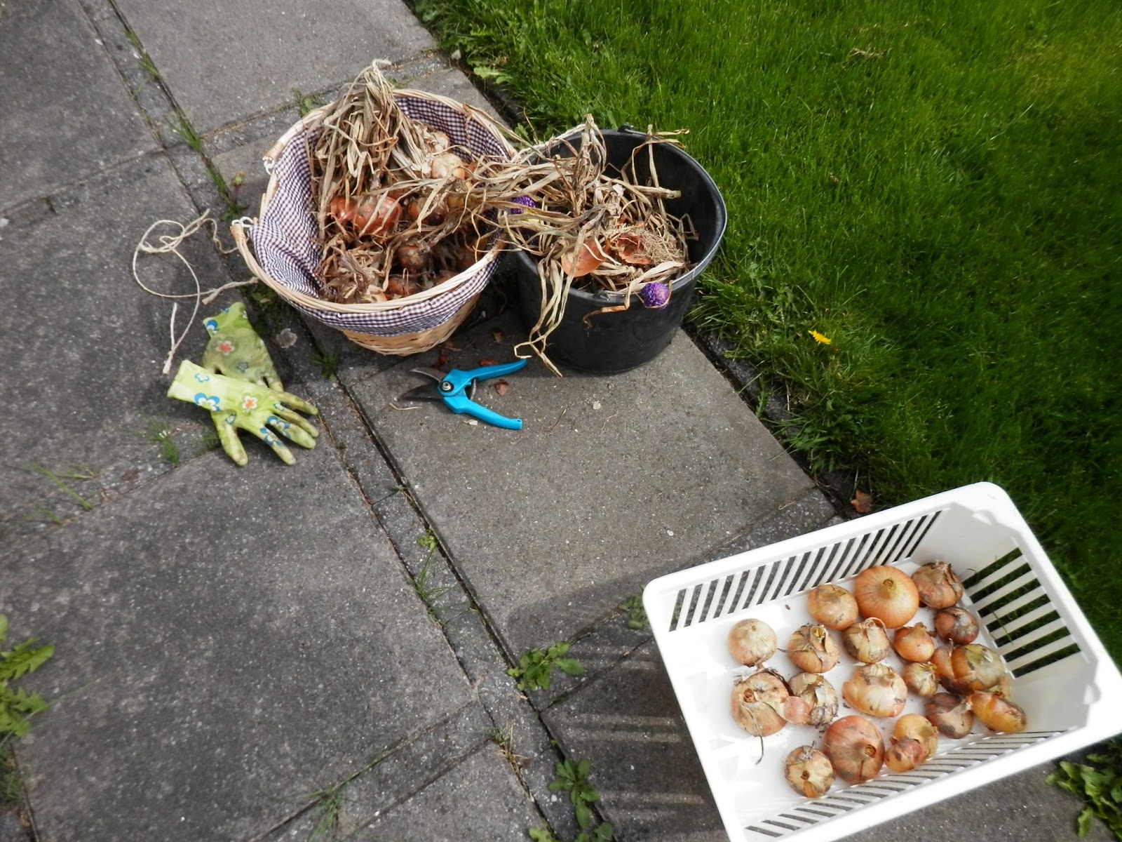 Daarna nog wat klusjes in de tuin. De uien moesten schoongemaakt worden en opgeslagen. Ik knip altijd de wortels er af en het afgestorven loof en daarna gaan ze in het krat. Bewaar uien nooit naast de aardappels, de aardappels gaan anders sneller “schieten”( scheuten maken om te ontkiemen)