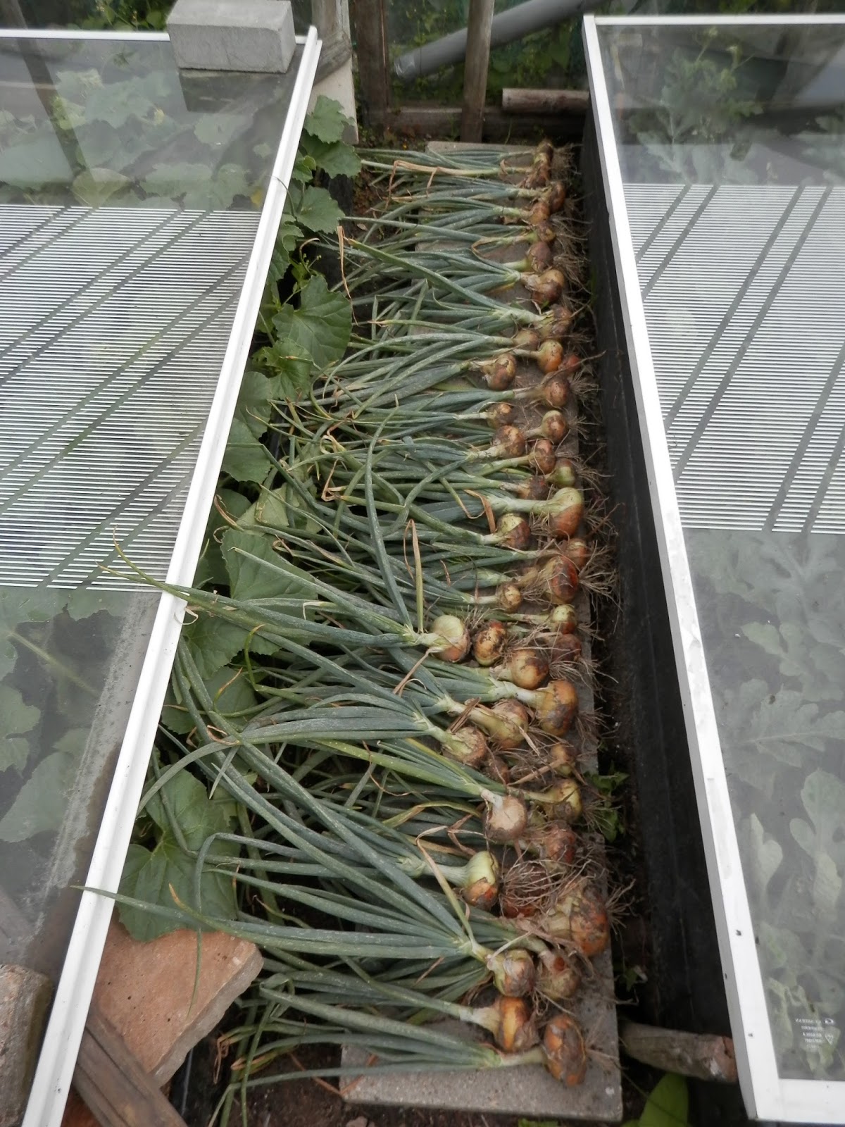 Omdat de grond nu niet hard is ook gelijk maar de uien geoogst. Het loof ging al strijken en ik had natuurlijk nog een paar weken kunnen wachten maar groeien doen ze bijna niet meer want de meesten vormen al een bruine schil. Inmiddels hangen ze nu in bundels in de schuur.