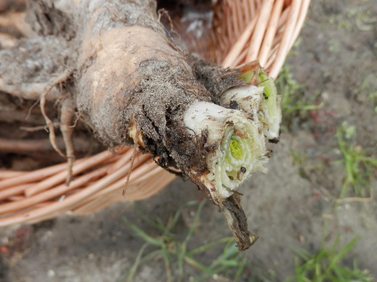 In mei gingen de zaadjes de grond in… de witlofwortels. Ze werden vertroeteld en verzorgd met alle liefde en zorgen die een witlof zich maar kan wensen. Ze staan het liefst in schrale grond die het jaar ervoor werd bemest. Ze werden liefdevol maar met harde hand uitgedund En ze groeiden goed, vormden groot blad en de wortels die werden geoogst in oktober…. nou ja, ze konden wel wat groter maar toch was ik tevreden.