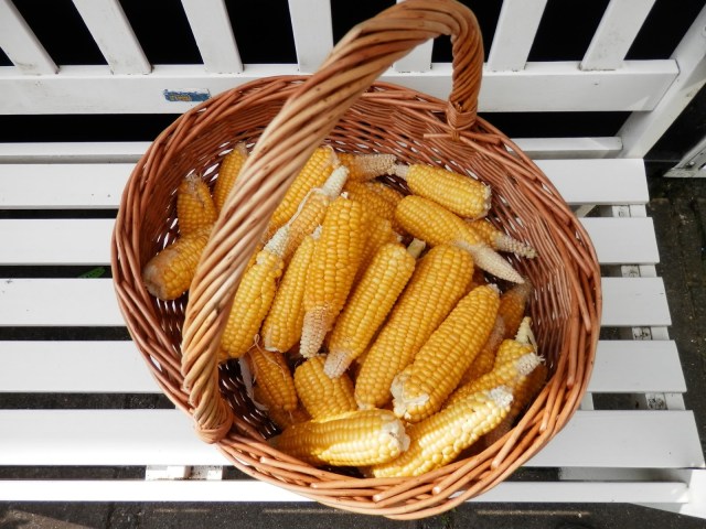 En dit was het resultaat van pakjesmiddag😊 Een mand vol mais.Je kan goed zien dat een groot deel van de kolven niet volgroeid is. Maakt niet uit hoor, beter dan dit wordt het niet meer, de planten zijn aan het afsterven dus ze groeien niet meer.